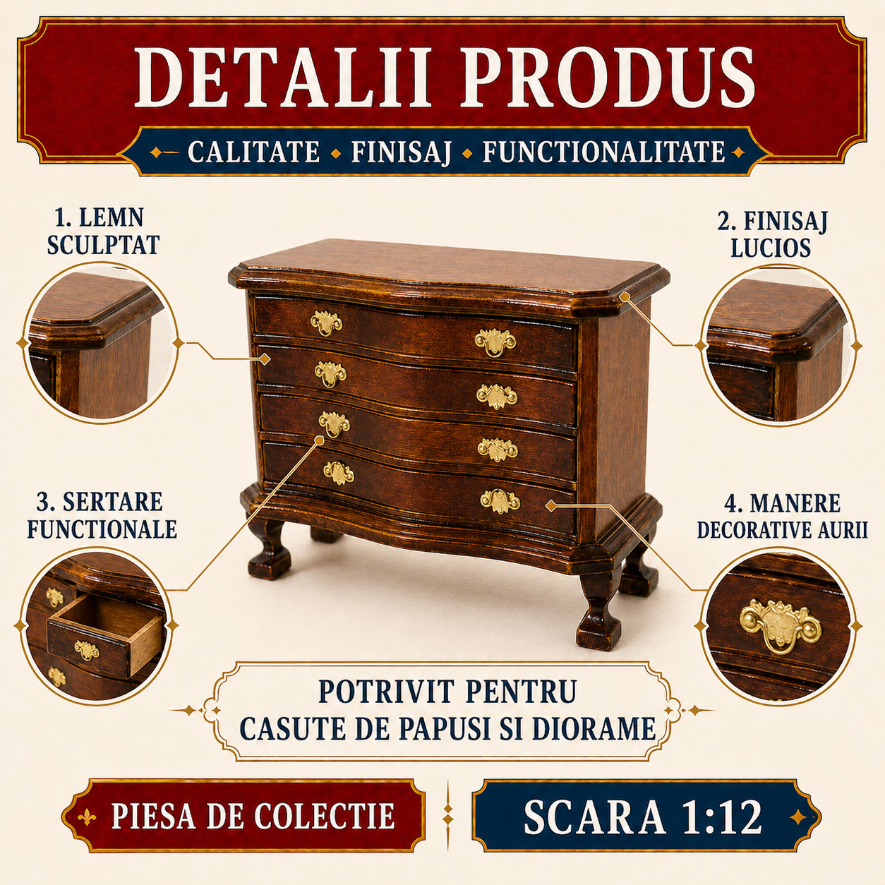 Piesa este prevazuta cu 4 randuri de sertare functionale, care se deschid, fiecare fiind decorat cu manere aurii. Aceste detalii adauga realism si valoare decorativa, facand comoda ideala pentru colectionari si pasionati de miniaturi.