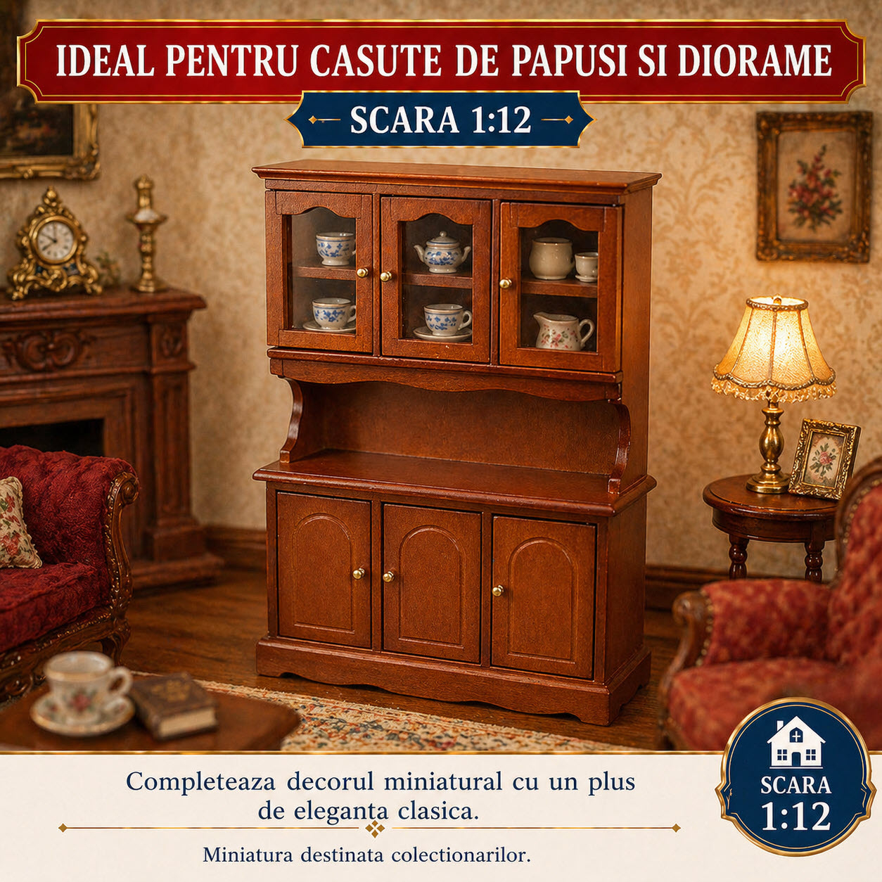 Produsul are dimensiunile de 11 x 4 x 15,5 cm si este potrivit pentru mobilier miniatural la scara 1:12. Este recomandat colectionarilor si pasionatilor de miniaturi care doresc sa creeze decoruri detaliate si armonioase pentru casute de papusi sau diorame.