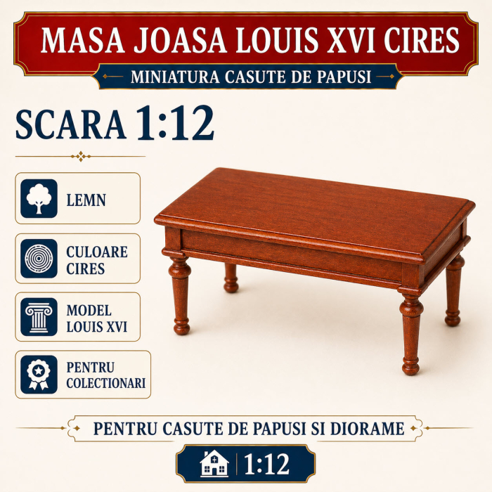 Completeaza decorul unei casute de papusi cu aceasta masa joasa Louis XVI din lemn cires, realizata ca miniatura la scara 1:12 pentru casute de papusi, diorame si colectii. Designul clasic, cu blat dreptunghiular, margini elegante si picioare atent profilate, ofera piesei un aspect rafinat, potrivit pentru saloane miniaturale, camere de zi, biblioteci sau decoruri elegante de inspiratie clasica.