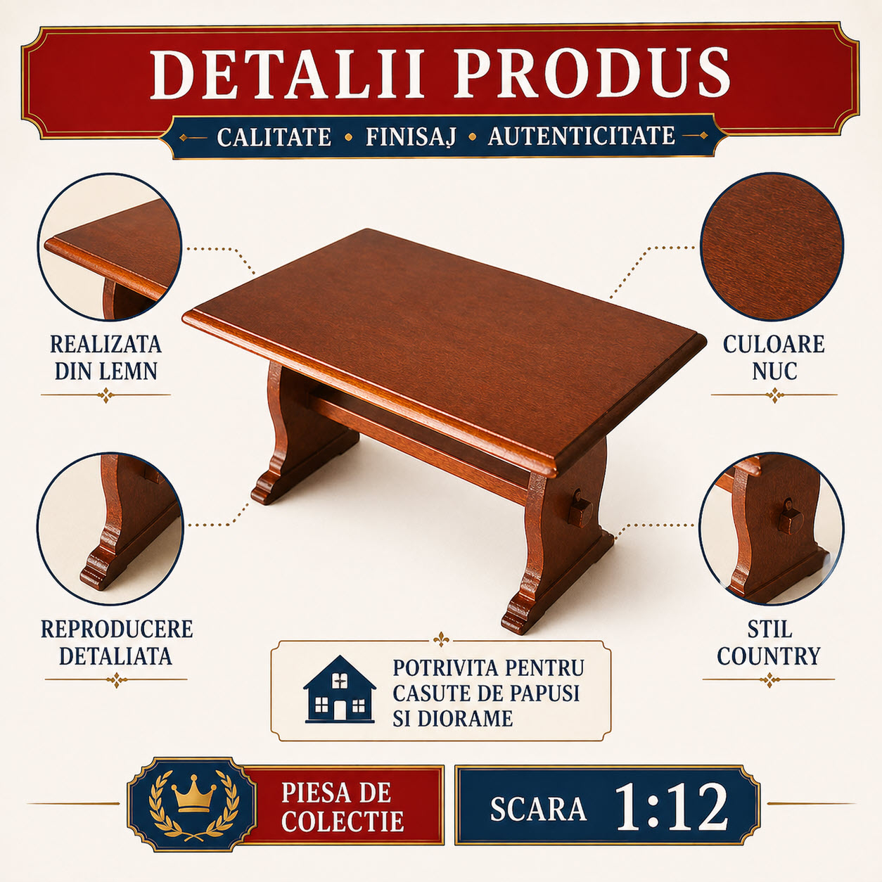 Adauga un plus de farmec decorului miniatural cu aceasta masa din lemn tip Country, realizata in eleganta nuanta nuc. Piesa este o reproducere detaliata la scara 1:12, conceputa special pentru casute de papusi, diorame si colectii de miniaturi.