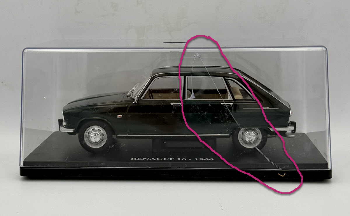 Produsul prezinta defect: Vitrina de protectie prezinta crapaturi (defect semnalat in poze), Macheta este intacta.