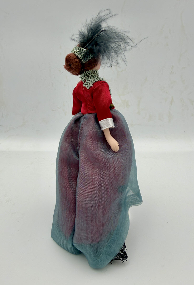 Aceasta papusa din portelan in miniatura, realizata la scara 1/12, aduce in colectia ta eleganta si rafinamentul modei de epoca. Papusa este imbracata intr-o rochie rosie de epoca, cu un design clasic si atent finisat, completata de o palarie asortata, care ii accentueaza stilul elegant.